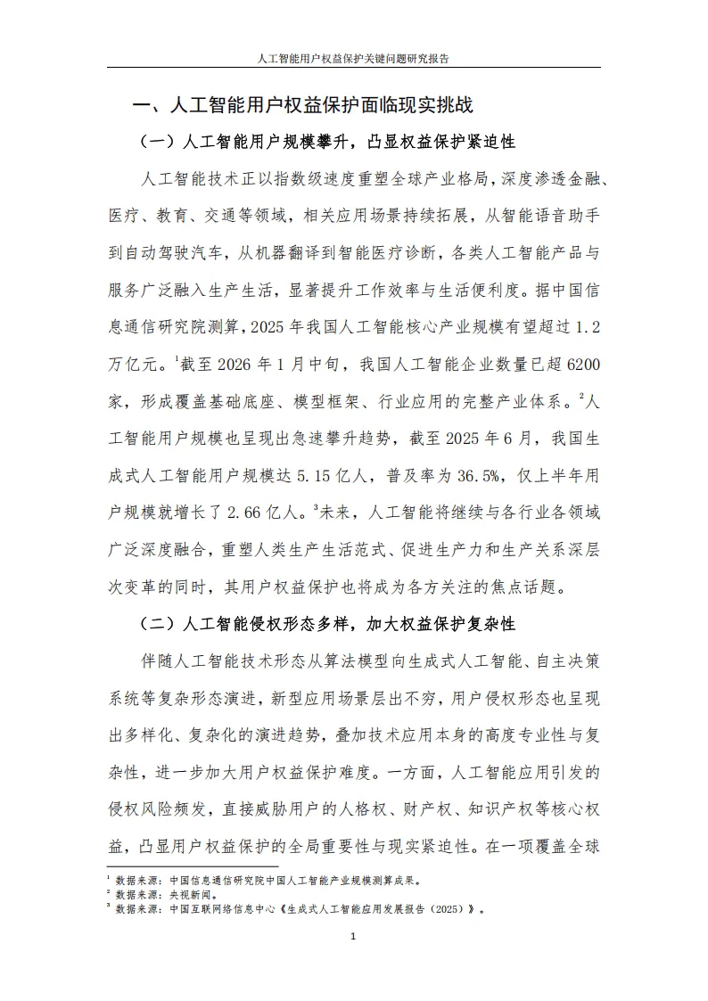 2026年2月中国互联网协会知识产权工作委员会与度小满科技联合发布的《人工智能用户权益保护关键问题研究报告》,聚焦人工智能产业快速发展下的用户权益保护难题,系统剖析相关风险并提出应对策略。报告指出,当前我国人工智能产业规模与用户规模快速攀升,2025年核心产业规模有望超1.2万亿元,生成式人工智能用户达5.15亿,但侵权形态多样、责任边界模糊、损害后果呈系统性等问题,让用户权益保护面临紧迫性与复杂性,超半数受访者担忧AI带来的安全、隐私问题,且多数人认为现有法律保障不足。
