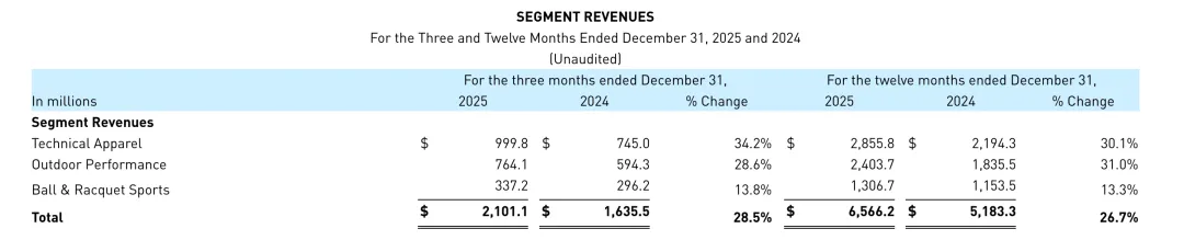 值得注意的是,始祖鸟所在的技术服装板块2025年第四季度业绩增长34%达近10亿美元