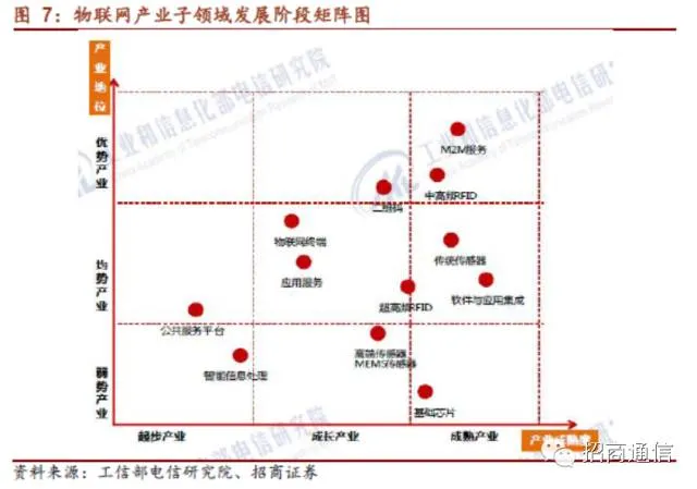整体来看,我国在M2M服务、中高频RFID、二维码等产业环节具有一定优势,在基础芯片设计、高端传感器制造、智能信息处理等产业环节较为薄弱,物联网大数据处理和公共平台服务处于起步阶段,物联网相关的终端制造、应用服务、平台运营管理仍在成长培育阶段。