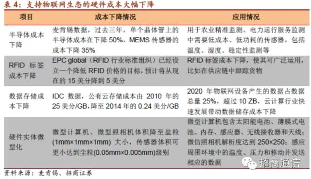 根据麦肯锡的数据,近年来微电子成本的下降带来了关键组件的成本下降,从而带动整体硬件成本大幅下降,这一点成为物联网生态发展的主要驱动力之一。包括传感器、RFID电子标签、云存储、网络传输等,并且计算、存储、传感等硬件越来越微型化,给物联网的产品部署带来极大便利,能耗降低显著提升。