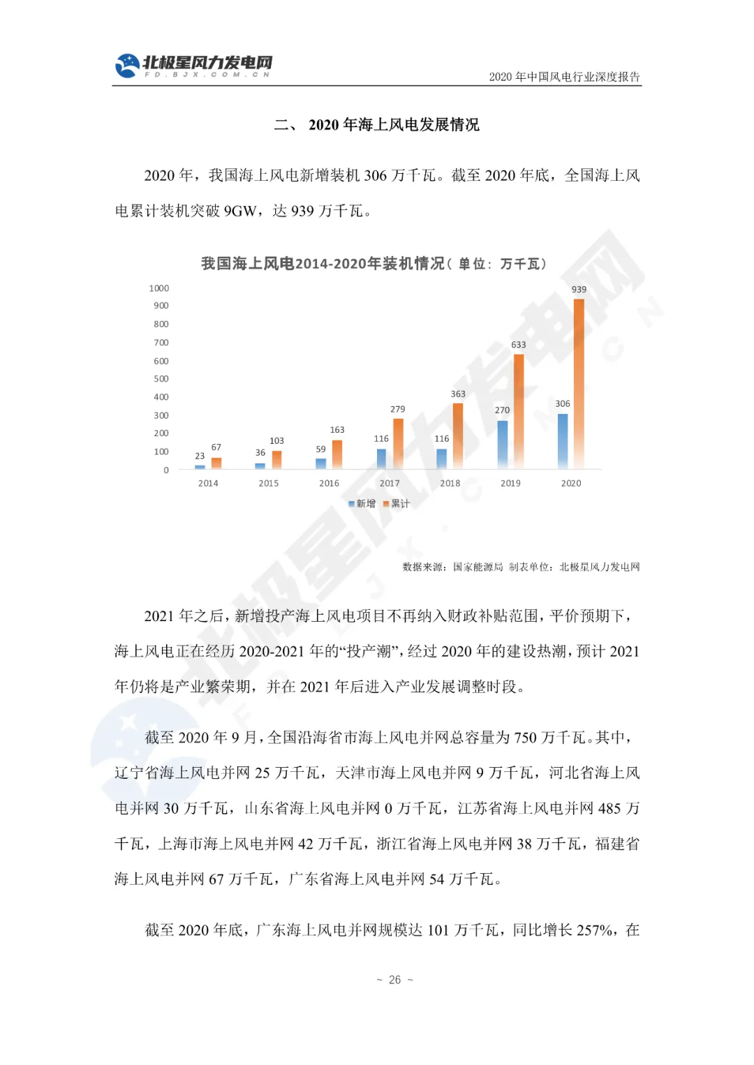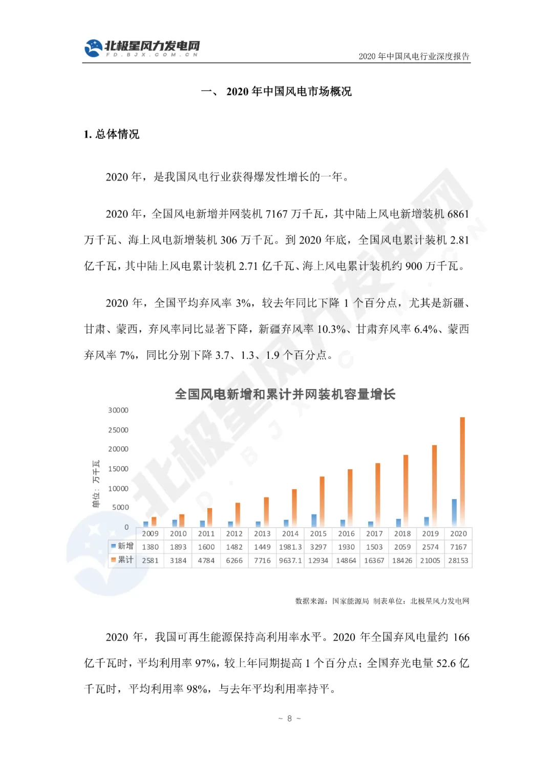 2020年,全国风电新增并网装机7167万千瓦,其中陆上风电新增装机6861万千瓦、海上风电新增装机306万千瓦。到2020年底,全国风电累计装机2.81亿千瓦,其中陆上风电累计装机2.71亿千瓦、海上风电累计装机约900万千瓦。