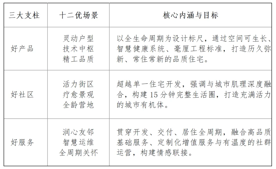近年来,华润置地将“好房子”建设视为驱动企业长远发展的系统性工程,以“品质给城市更多改变”为理念,致力于推动住宅产品从物理空间向承载情感、文化与和谐邻里关系的“美好生活场景”全面升级。依托深圳沄玺、上海沄启滨江、重庆观宸等“好房子”样板项目实践,华润置地不仅构建了“三好十二优”(好产品、好社区、好服务和十二优场景,详见下表)人居价值体系,更在规划设计、施工建造、运营服务全链条形成了制度化的方法论与标准化的管控框架。通过实施覆盖全生命周期的品质管控体系,华润置地成功锻造了“产品力、交付力、服务力”等核心能力,并在智慧互联、透明建造、文化融合与片区统筹等方面,形成了特色鲜明的“好房子”建设系统化解决方案。