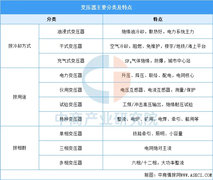 变压器可以按照相数、冷却方式、用途等方式进行分类:
