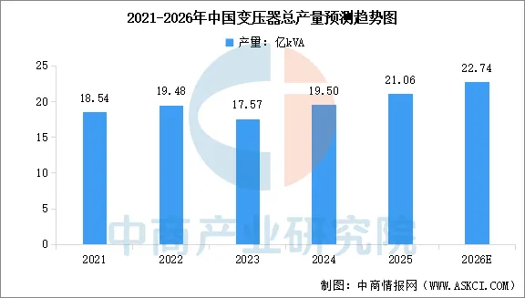 中商产业研究院发布的《2025-2030年中国电力设备行业深度挖掘及投资决策分析报告》显示,2024年全国变压器总产量达到约19.5亿kVA,较2023年增加11%。其中,高压变压器(66kV及以上)产量12.83亿kVA,配电变压器(35kV及以下)产量6.45亿kVA。2025年全国变压器总产量约21.06亿kVA,中商产业研究院分析师预测,2026年全国变压器总产量将达到22.74亿kVA。