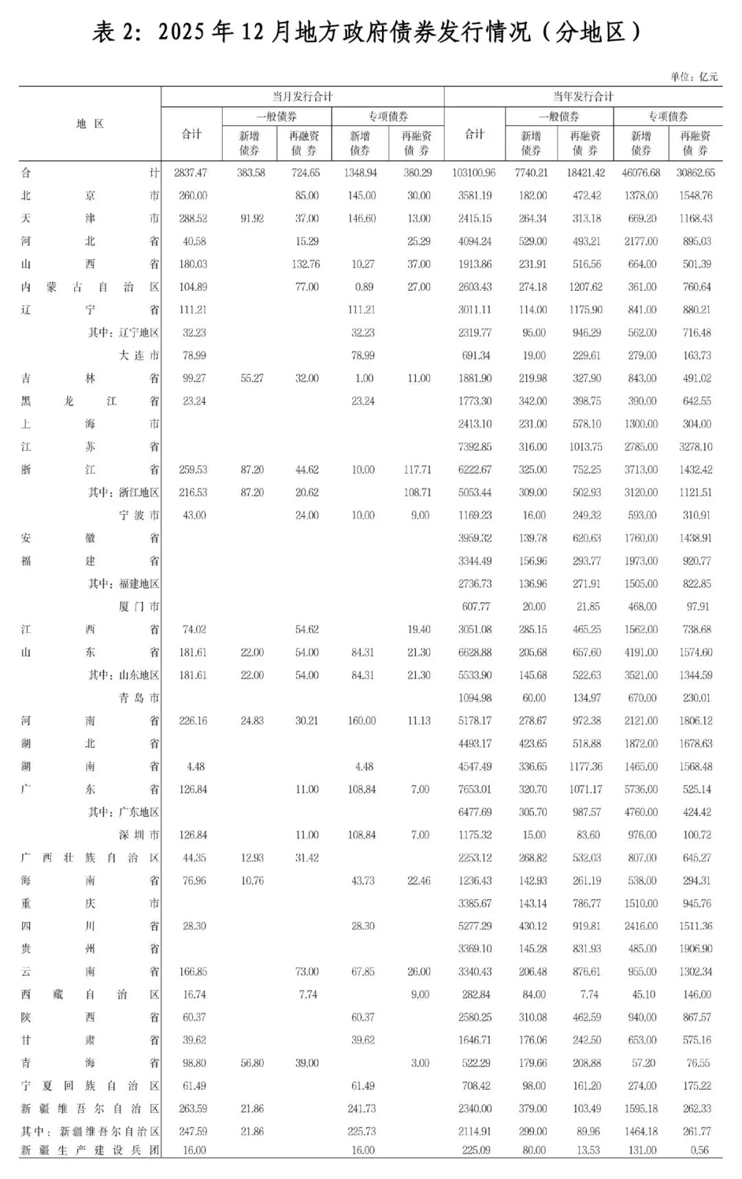 1-12月,全国36个省、自治区、直辖市、计划单列市及新疆生产建设兵团发行地方政府债券2462只,共计103100.96亿元。其中,一般债券26161.63亿元,专项债券76939.33亿元。