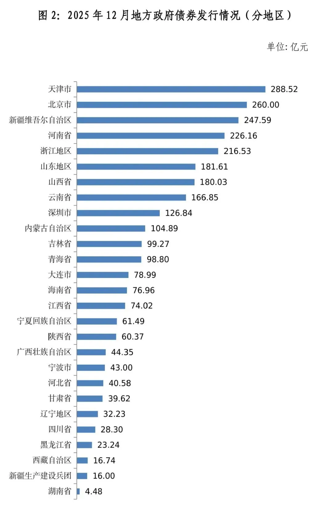 从发行地区看,26个省、自治区、直辖市、计划单列市及新疆生产建设兵团12月发行了地方政府债券(见表2)。债券发行规模较大的有天津市288.52亿元、北京市260.00亿元、新疆维吾尔自治区247.59亿元(见图2)。