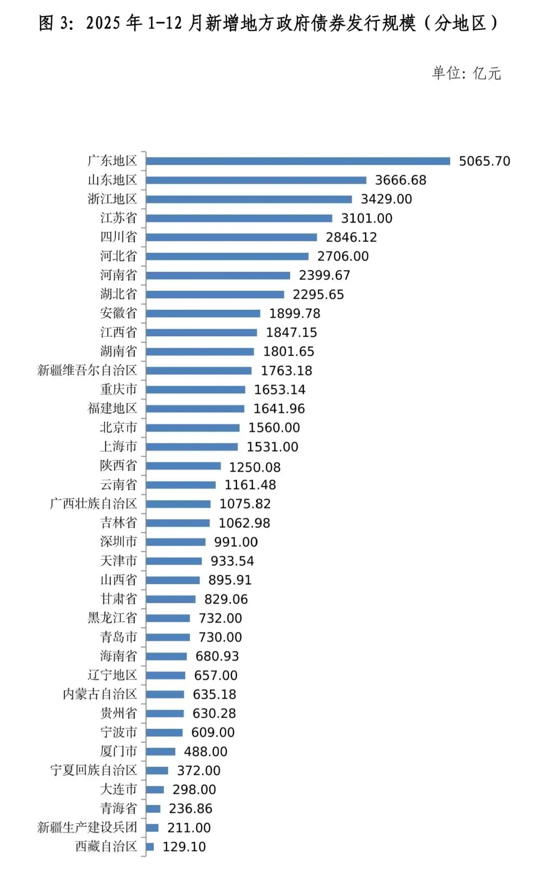 1-12月,全国36个省、自治区、直辖市、计划单列市及新疆生产建设兵团发行了新增债券53816.89亿元。其中,一般债券7740.21亿元,专项债券46076.68亿元。1-12月新增地方政府债券发行规模(分地区)见图3。