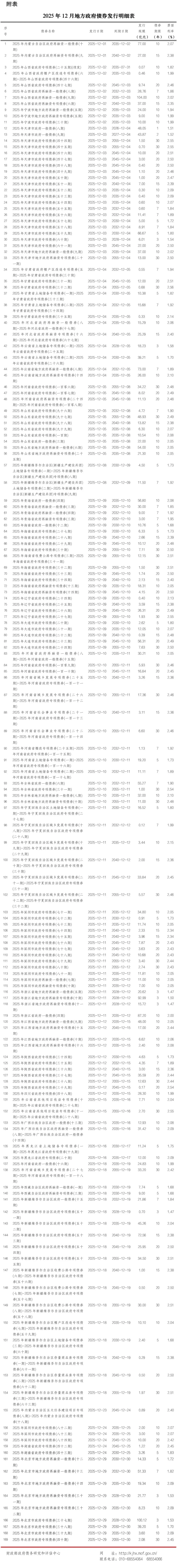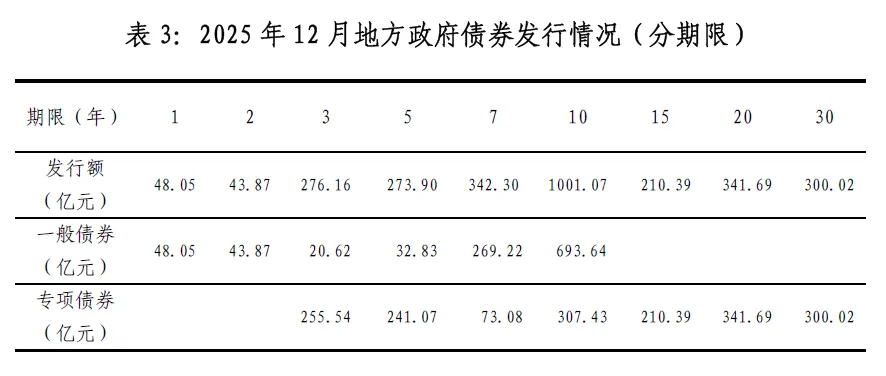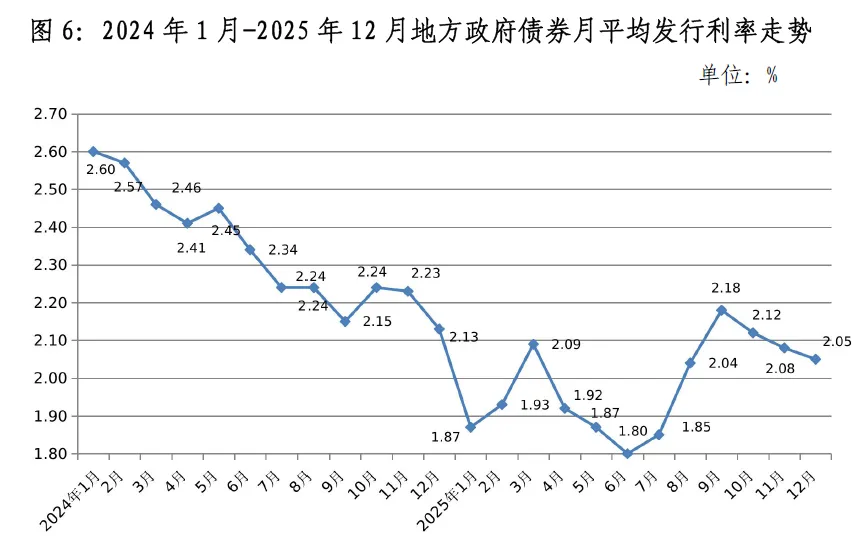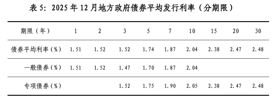 12月,地方政府债券平均发行利率2.05%,环比下降3bp,同比下降8bp。其中,一般债券1.94%,专项债券2.12%。2024年1月-2025年12月地方政府债券月平均发行利率走势见图6。2025年12月不同期限地方政府债券平均发行利率见表5。