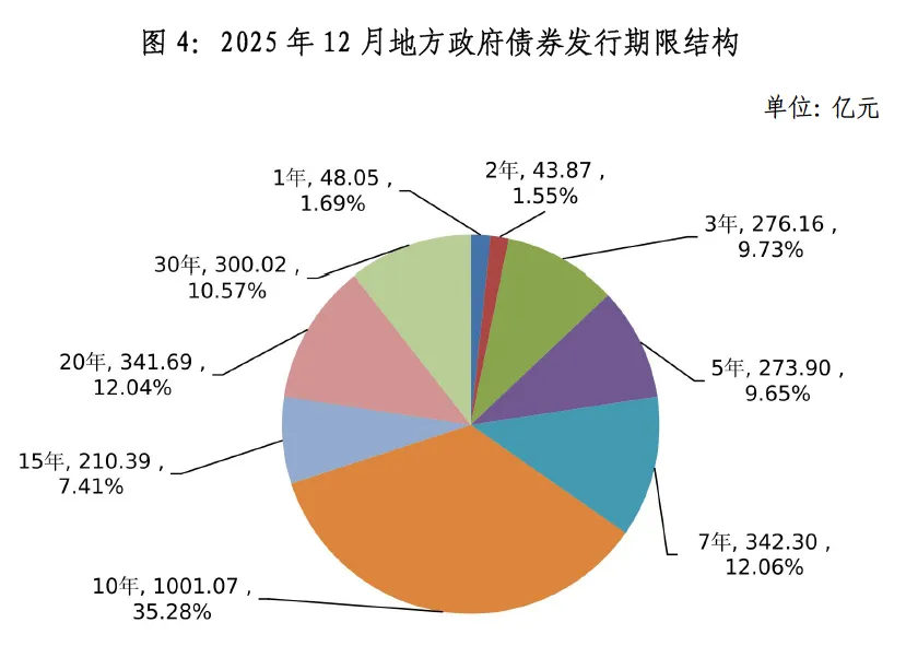 12月,地方政府债券平均发行期限11.89年,环比减少2.74年,同比减少6.48年。其中,一般债券8.29年,专项债券14.20年。不同期限债券发行规模和期限结构见表3、图4。