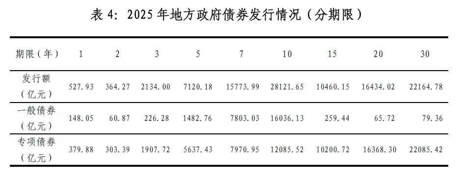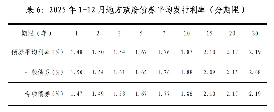 1-12月,地方政府债券平均发行利率1.97%,同比下降32bp。其中,一般债券1.83%,专项债券2.02%。2025年1-12月不同期限地方政府债券平均发行利率见表6。
