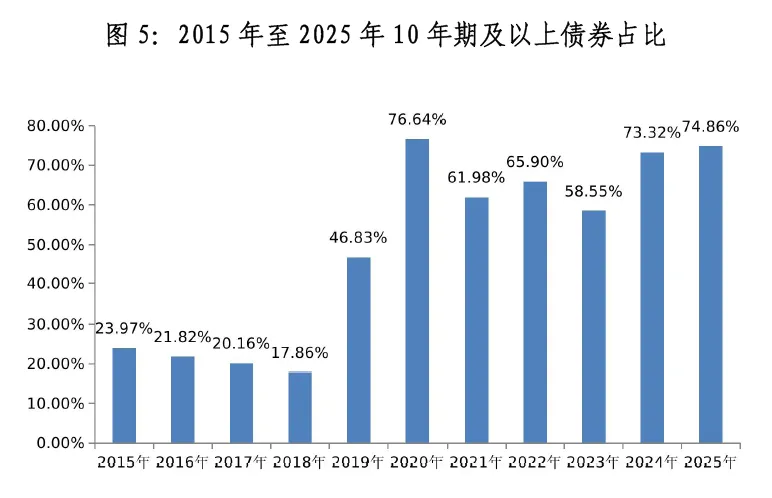 1-12月,地方政府债券平均发行期限15.38年,同比增加0.97年。其中,一般债券8.83年,专项债券17.60年。不同期限债券发行规模见表4。10年期及以上债券77180.60亿元,占比74.86%。2015年至2025年10年期及以上债券占比见图5。