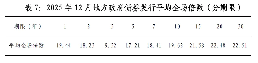 从认购倍数看,12月地方政府债券发行平均全场倍数为19.01倍。其中,一般债券19.87倍,专项债券18.46倍。不同期限债券发行平均全场倍数见表7。