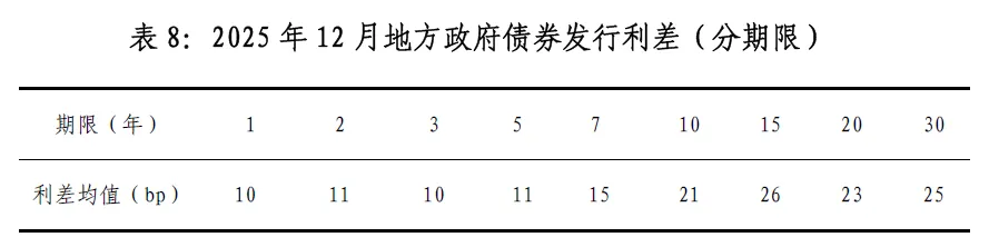 从债券发行利差看,12月地方政府债券发行利差区间为负2bp至35bp,利差均值为20bp。环比利差区间扩大,下限下降5bp,上限上升5bp,利差均值较上月上升2bp。不同期限债券发行利差见表8。