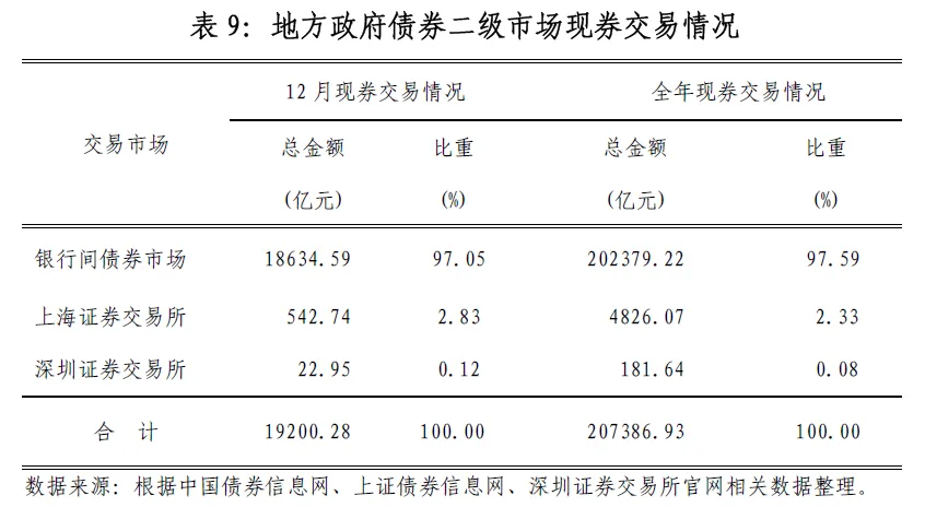 12月,地方政府债券二级市场现券交易金额19200.28亿元。其中,银行间债券市场18634.59亿元,上海证券交易所542.74亿元,深圳证券交易所22.95亿元。当月现券交易日平均换手率为1.53‰。