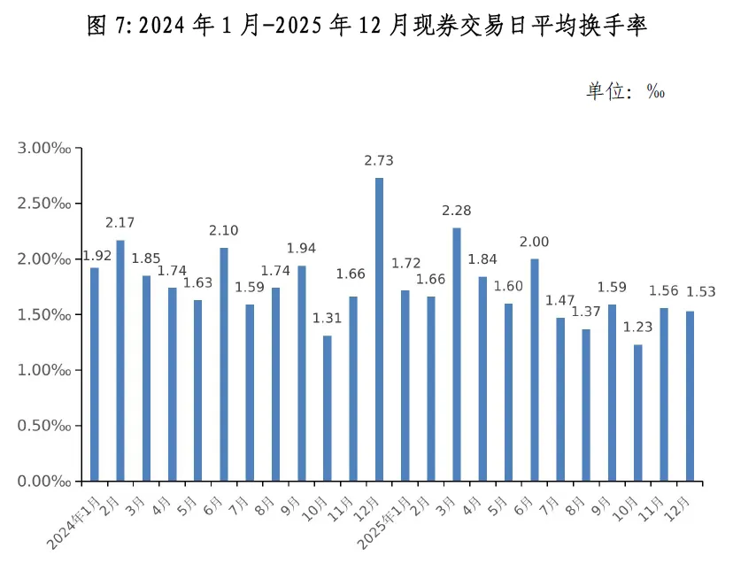 1-12月,地方政府债券二级市场现券交易金额207386.93亿元。其中,银行间债券市场202379.22亿元,上海证券交易所4826.07亿元,深圳证券交易所181.64亿元。1-12月地方政府债券二级市场现券交易情况见表9,2024年1月-2025年12月现券交易日平均换手率见图7。