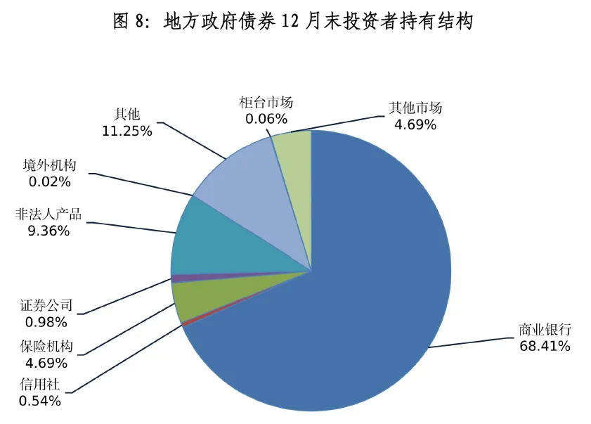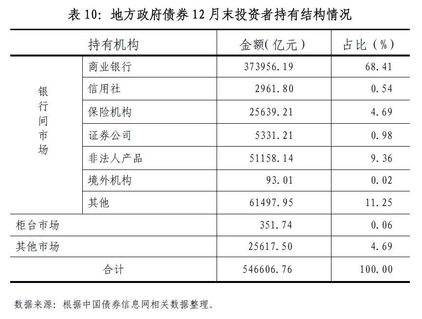 截至12月末,银行间债券市场投资者持有地方政府债券520637.51亿元,占比95.25%;柜台市场投资者持有351.74亿元,占比0.06%;其他市场投资者持有25617.50亿元,占比4.69%。银行间债券市场投资者中,商业银行持有373956.19亿元,占比68.41%;非法人产品持有51158.14亿元,占比9.36%;保险机构持有25639.21亿元,占比4.69%;境外机构持有93.01亿元,占比0.02%;其他境内机构持有69790.96亿元,占比12.77%。地方政府债券12月末投资者持有结构情况见表10、图8。