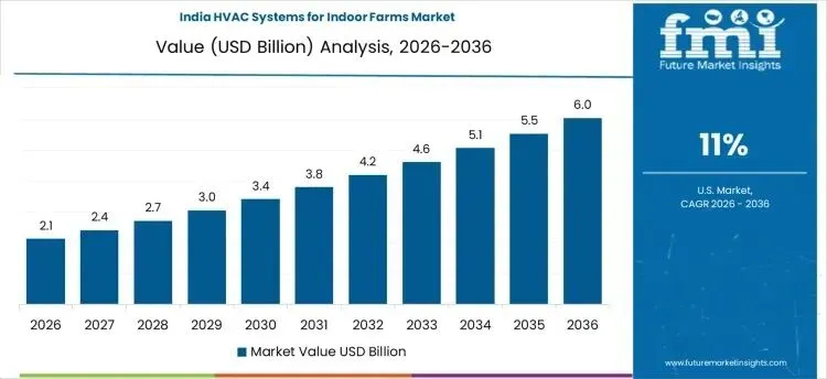 印度的复合年增长率为11%,这得益于室内农场市场采用暖通空调系统的解决方案,以提升气候控制、植物生长效率和可控环境农业的运营可靠性。制造商和供应商正在生产针对温度稳定性、能源效率及与室内农场集成优化的暖通空调系统。需求主要集中在温室农场、垂直农业单位和农业技术研发中心。投资重点在于系统性能、材料耐久性以及农业和能源标准的合规性,而非大规模部署。增长反映了室内农业的日益普及、工业对节能气候控制的关注以及对高产量作物需求的增加。