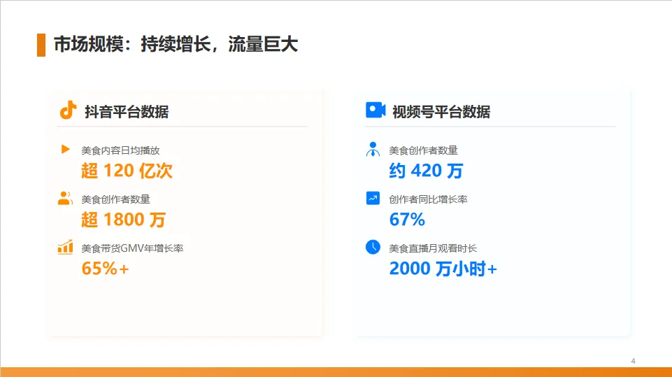 从具体数据来看,抖音美食内容日均播放量超过120亿次,创作者数量庞大。微信视频号虽然起步较晚,但增长迅猛,创作者数量同比增长了67%,直播观看时长也非常可观,显示出巨大的潜力。