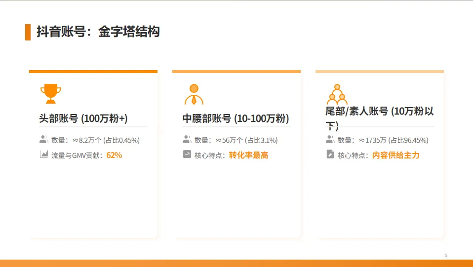 在抖音,美食账号呈现出典型的金字塔结构。虽然头部账号数量仅占0.45%,但却垄断了62%的流量和GMV;中腰部账号是转化率最高的群体;而尾部和素人账号则是内容创作的绝对主力。
