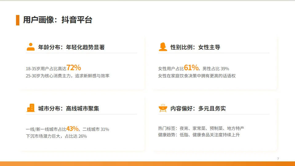 美食短视频的核心用户非常清晰:他们主要是18到35岁的年轻人,其中女性占多数,并且集中在一二线城市。他们喜欢看的内容包括夜宵、家常菜、预制菜等,这些信息对于内容创作和选品至关重要。