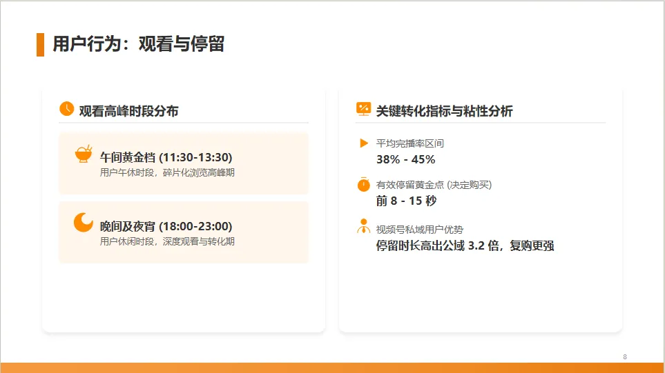 用户的观看行为也有规律可循。观看高峰集中在午间和晚间,平均完播率在38%到45%之间,而视频的前8到15秒是决定用户是否购买的黄金时间。值得注意的是,视频号的私域用户粘性更高,停留时间更长。