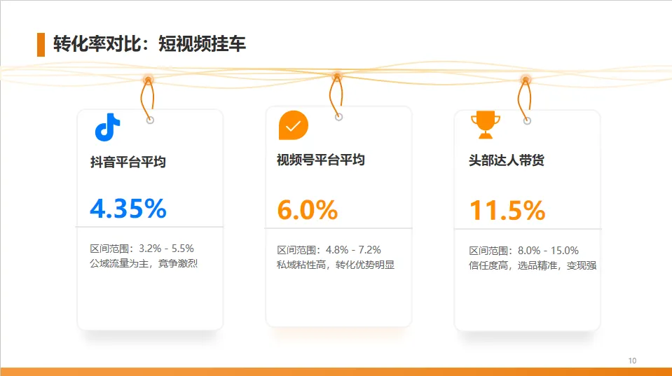 短视频挂车带货的转化率是衡量变现能力的关键指标。可以看到,视频号凭借其私域流量的优势,平均转化率高于抖音。而头部达人的转化率更是达到了8%到15%,体现了强大的带货能力。