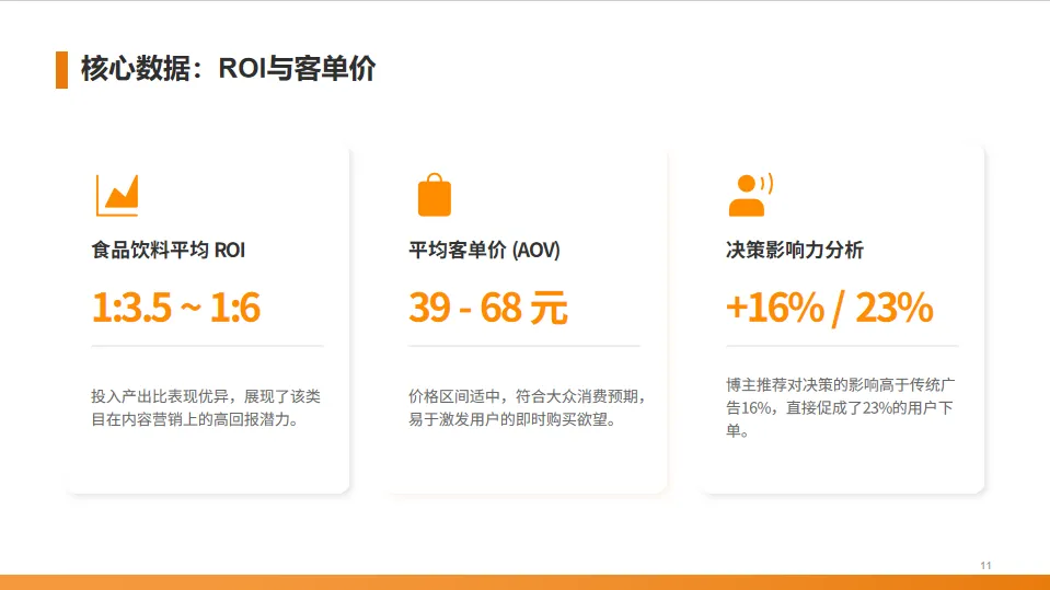 在投入产出比方面,食品饮料类目的平均ROI可以达到1比3.5到1比6,平均客单价在39到68元之间。更重要的是,美食博主的推荐内容对用户的购买决策影响显著,比传统广告更有效。