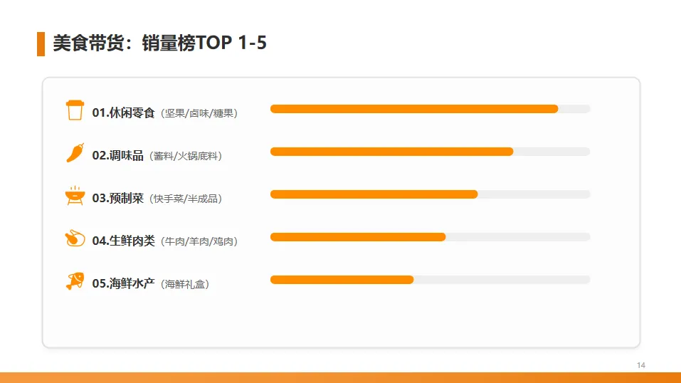 排名前五的品类分别是休闲零食、调味品、预制菜、生鲜肉类和海鲜水产。这些品类都具有易展示、易勾起食欲、复购率高的特点,非常适合短视频带货。