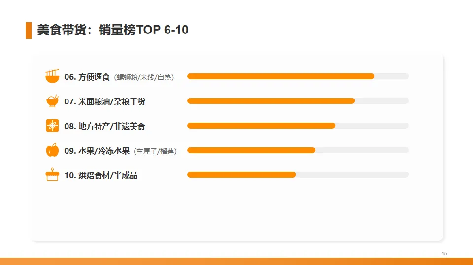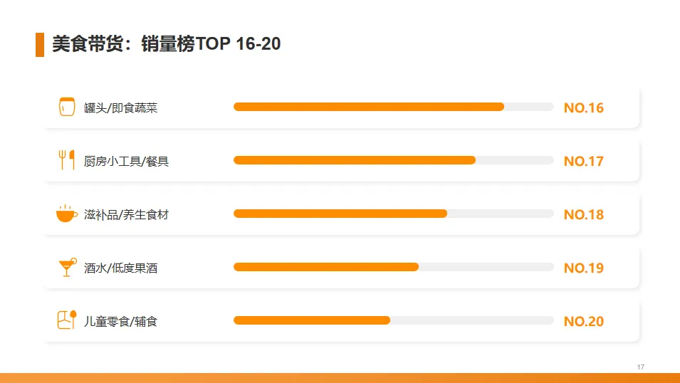 最后五位是罐头、厨房小工具、滋补品、酒水和儿童零食。这表明美食短视频的带货范围正在不断扩大,从食品本身延伸到了相关的厨具和养生品类。