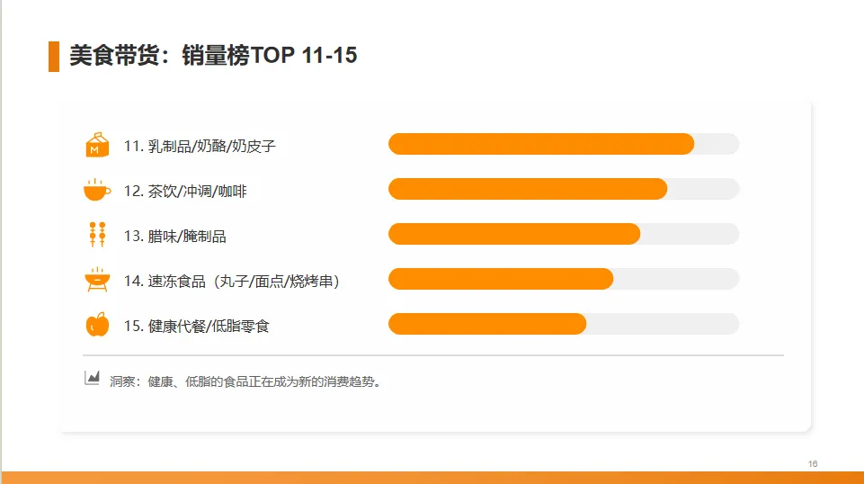 第11到15名包括乳制品、茶饮咖啡、腊味、速冻食品和健康代餐。可以看到,健康、低脂的食品正在成为新的消费趋势。