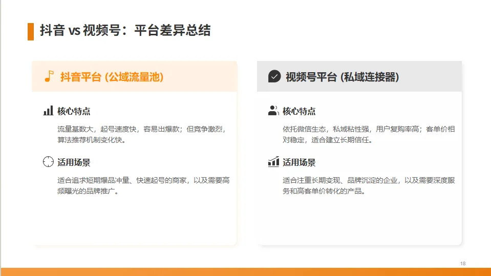 总结一下两个平台的差异:抖音适合追求爆品冲量和快速起号,而视频号则凭借其强大的私域流量,更适合品牌进行长期变现和用户沉淀。