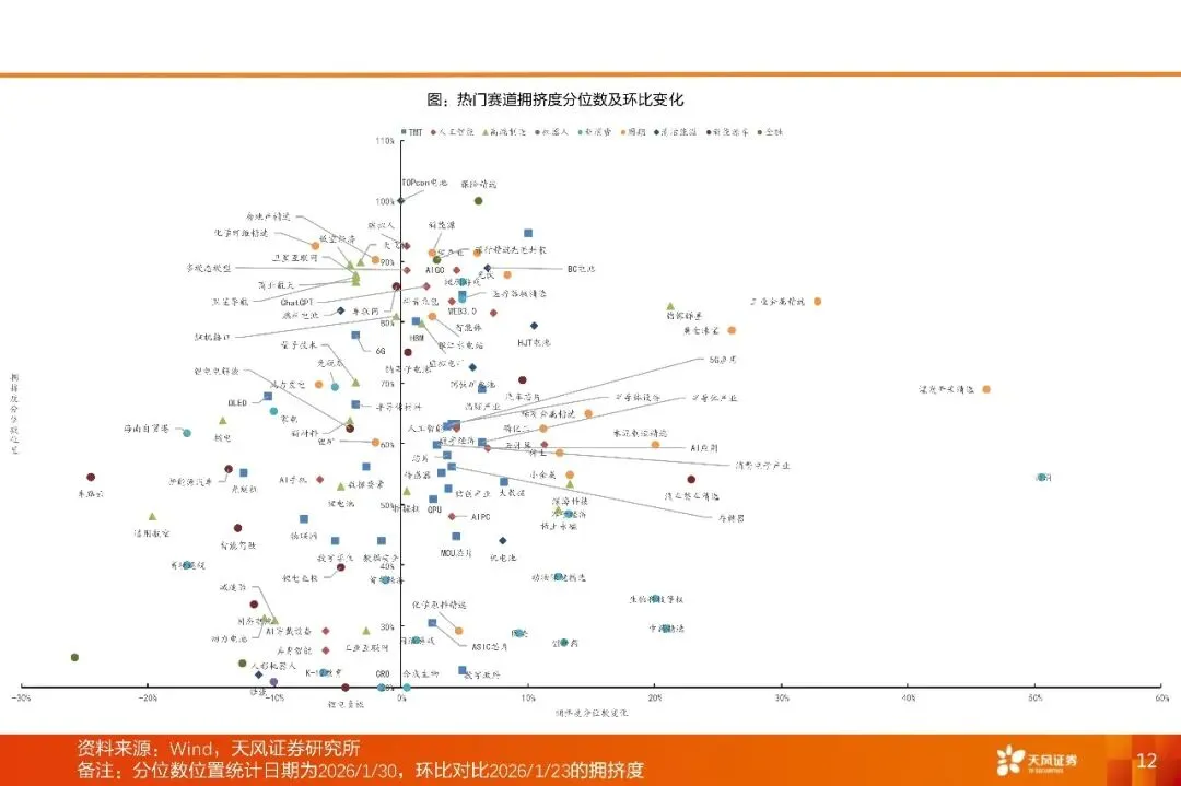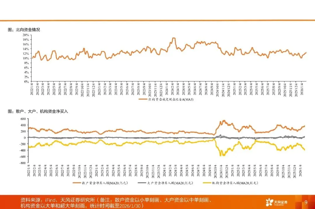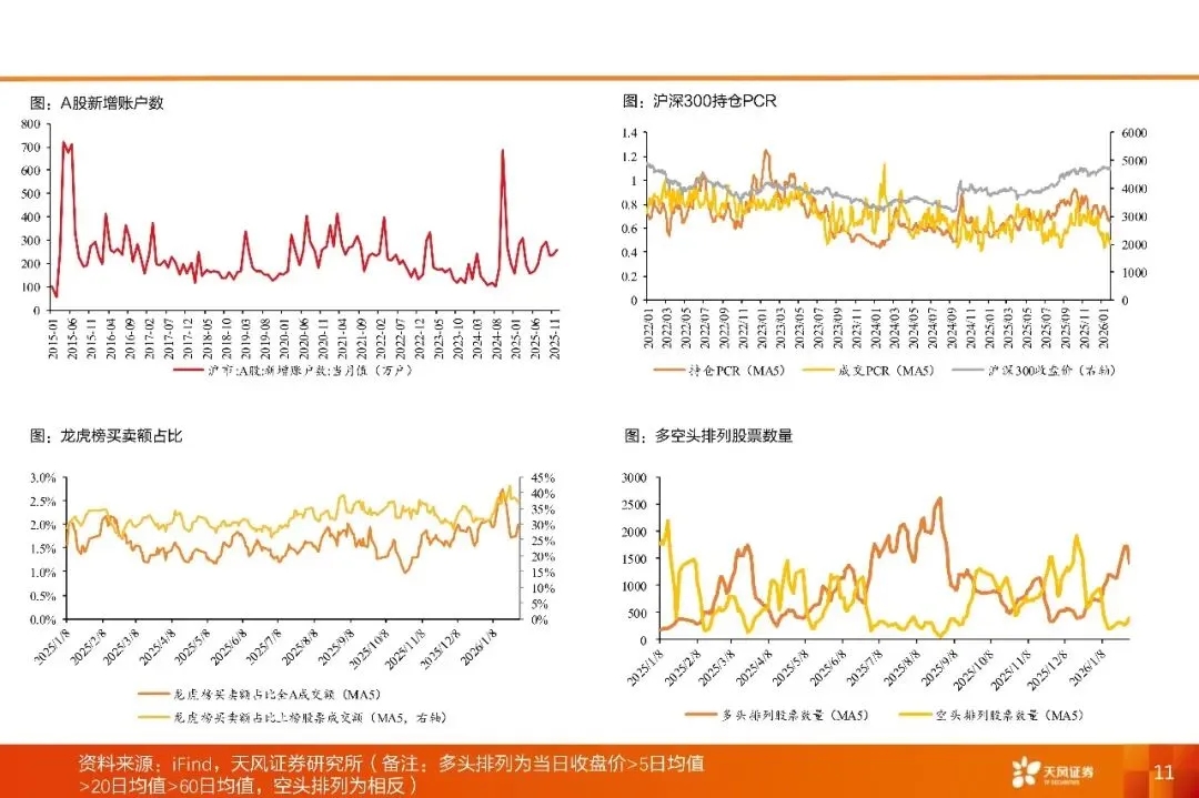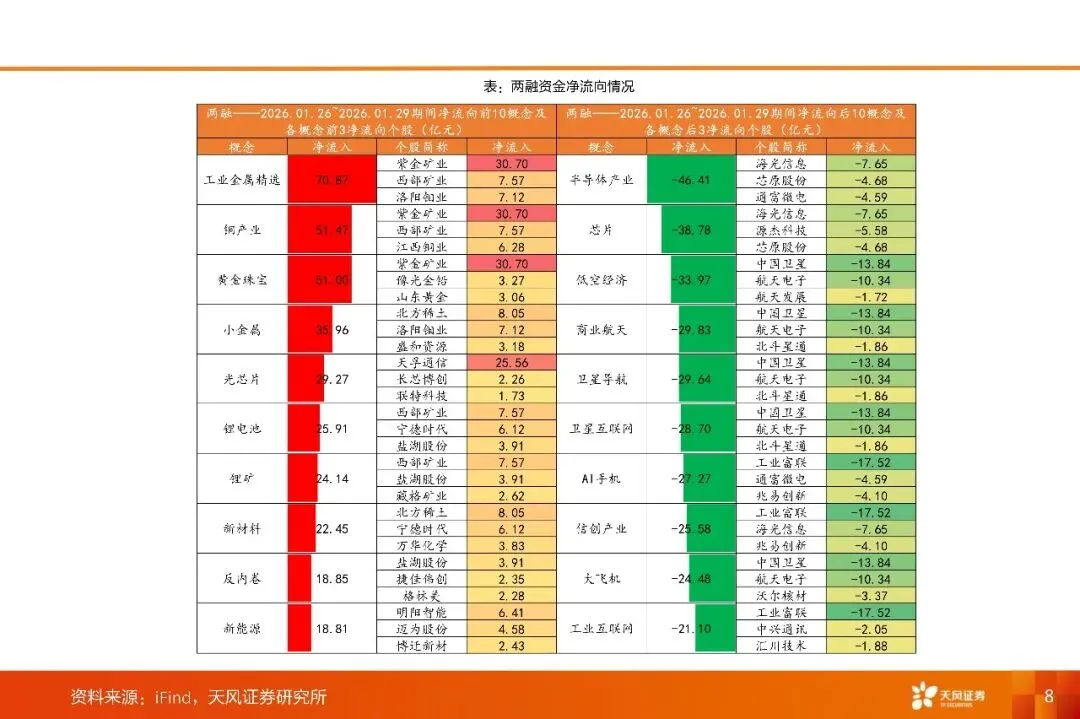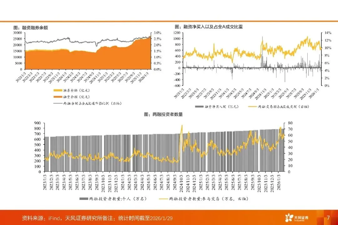 市场回顾:本周(1.26-1.30),全A下跌1.59%。板块方面,黄金、光模块相关概念表现强势。当周全A日均成交额达30597元,较前周增加2625亿元,市场活跃度上行。市场情绪方面,当周每日平均上涨家数为1813家,较交前周减少1290家;平均涨停家数由上周90家减少至71家,赚钱效应有所减弱。两融方面,融资融券余额升至27394亿元(截至1月29日),两融资金主要流向有色金属相关概念。拥挤度方面,保险相关概念拥挤度较高,白酒相关概念环比上周增幅较大。