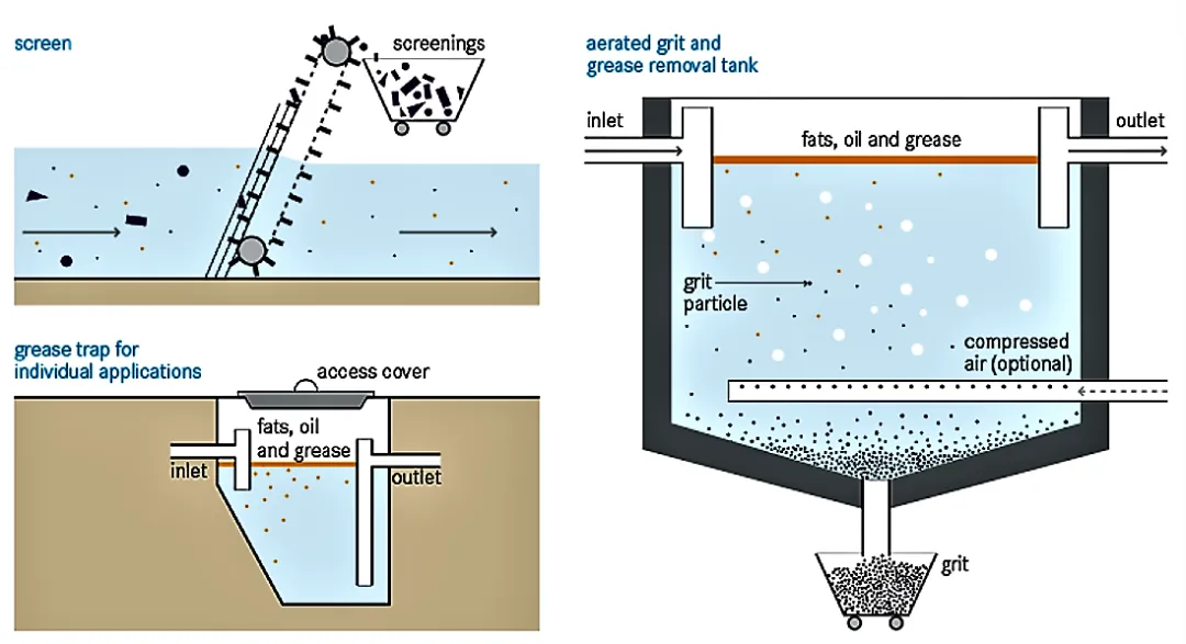 Preliminary treatment (pre-treatment) 初级处理(预处理):去除污水中的砂砾、碎石,过滤掉大颗粒固体物。
