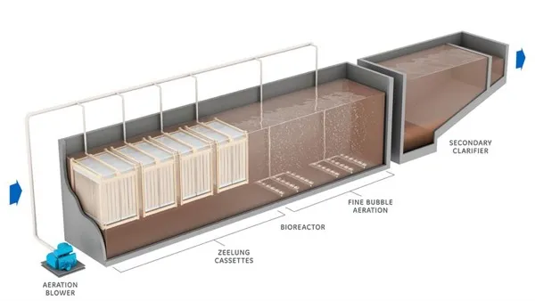 “Membrane Bioreactor” (MBR) combines a perm-selective membrane (e.g., microfiltration or ultrafiltration) with a suspended growth bioreactor in wastewater treatment. In contrast to “polishing” processes, MBRs integrate the membrane into the biological treatment directly. 膜生物反应器(MBR)是一种将选择性渗透膜(如微滤膜或超滤膜)与悬浮式生长的生物反应器相结合的污水处理技术。与“精处理”工艺不同,MBR技术直接将膜组件结合到生物处理单元中。