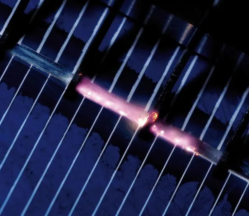 右图:用于太阳能电池互连的激光焊接工艺(Credit. Fraunhofer ILT)