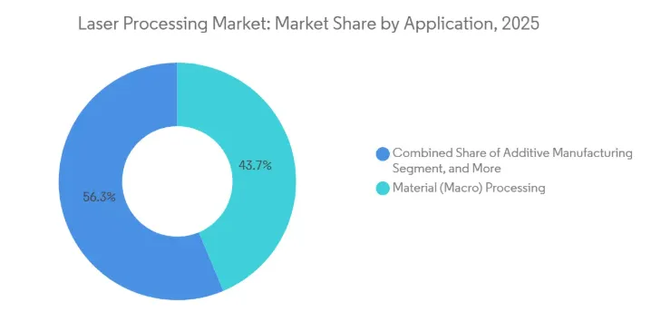 材料加工(宏加工)板块在2025年贡献了43.66%的市场收入,主要受汽车车身切割和造船厂船体焊接需求驱动。微加工以9.54%的复合年增长率位居所有应用之首,因电子产品微型化要求在 30 µm 以下钻孔且无热裂纹。激光清洗与表面硬化技术正加速渗透重型装备领域,替代传统镀铬及感应炉工艺。