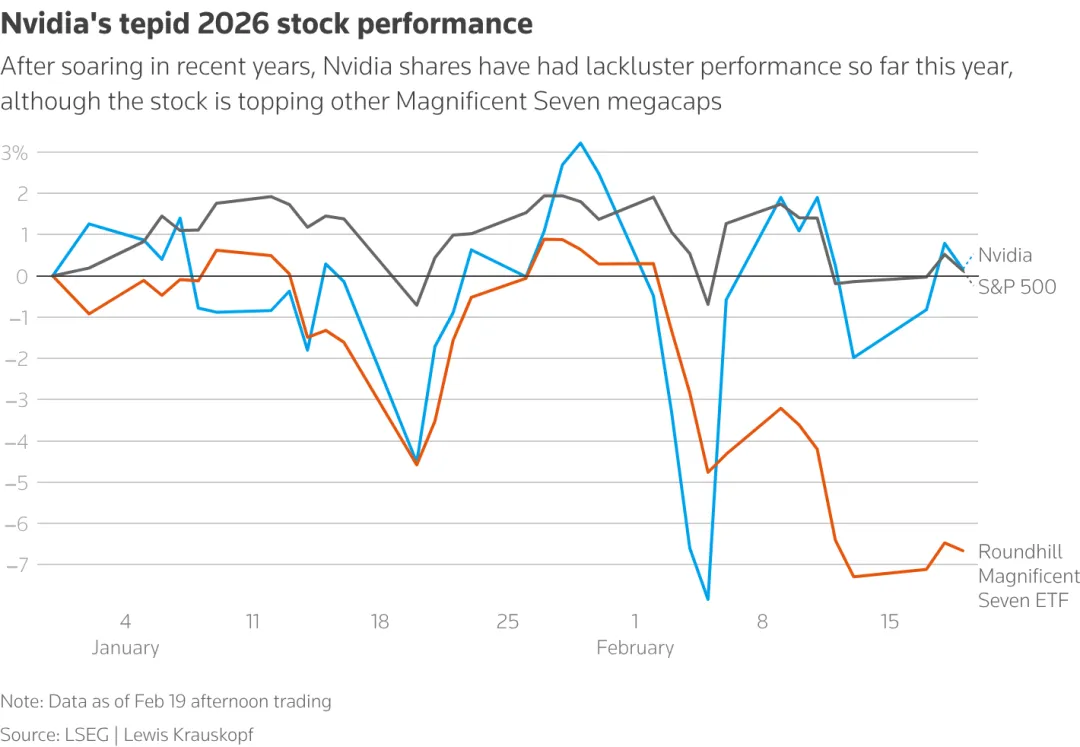 在过去三年里,英伟达推动了美国股市的大部分上涨,但截至2026年仅上涨了约2%。