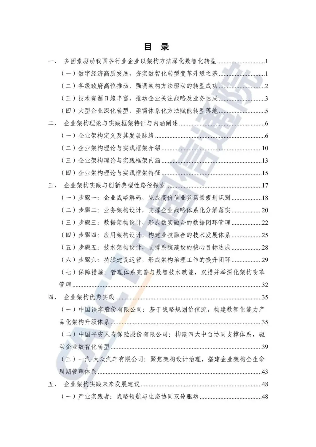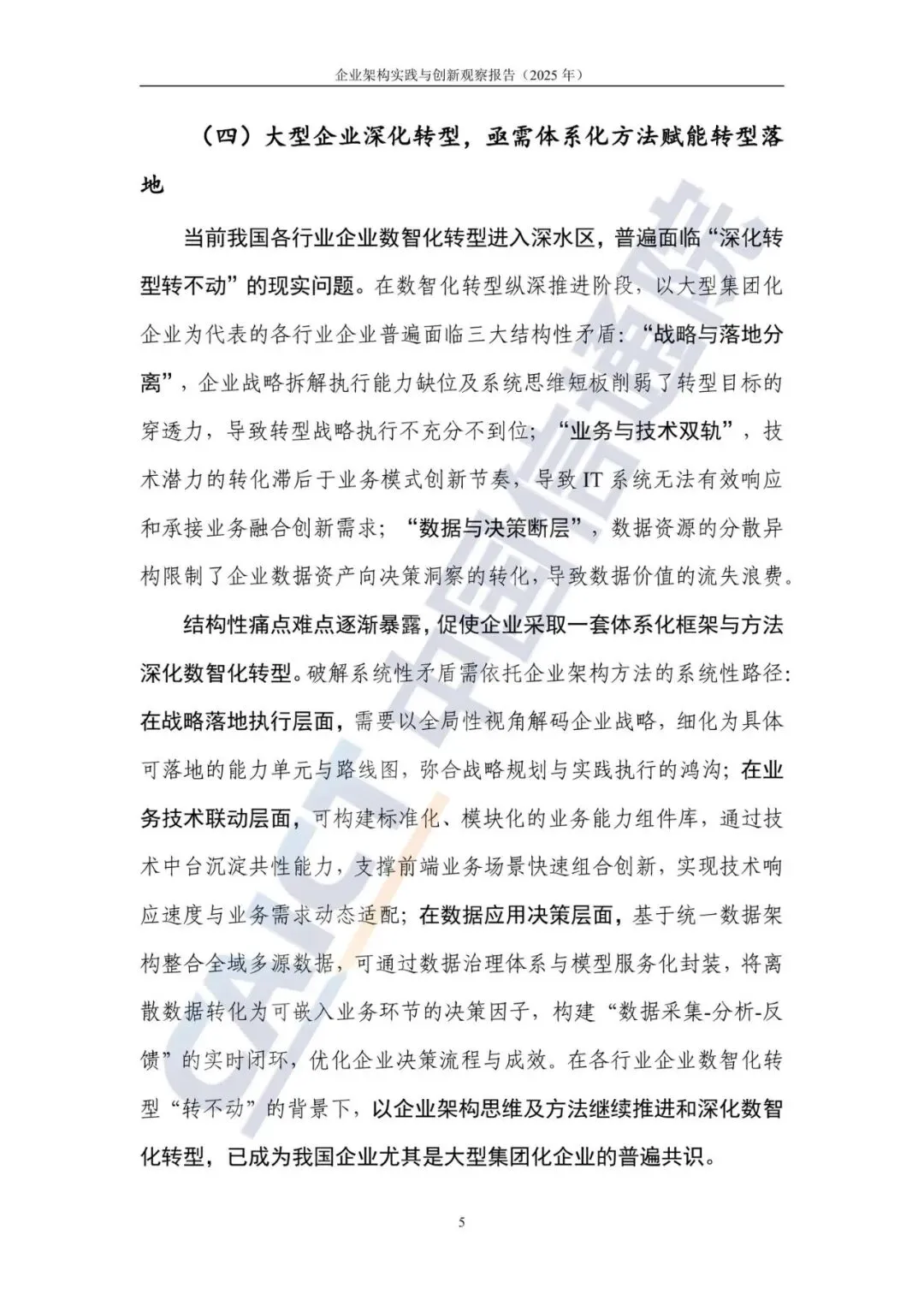 报告创新性地提出了一个包含六个核心步骤的企业架构实践路径。第一步是战略解码与高价值业务场景识别;第二步是业务架构设计,以支撑战略的体系化分解与落实;第三步是数据架构设计,旨在形成数实融合的数据闭环管理;第四步是应用架构设计,构建业技融合的技术发展体系;第五步是技术架构设计,以支撑系统建设目标达成;第六步是持续建设与运营,形成架构治理的提升闭环。此外,报告还强调了完善管理体系与赋能数智技术这两大保障措施的重要性。