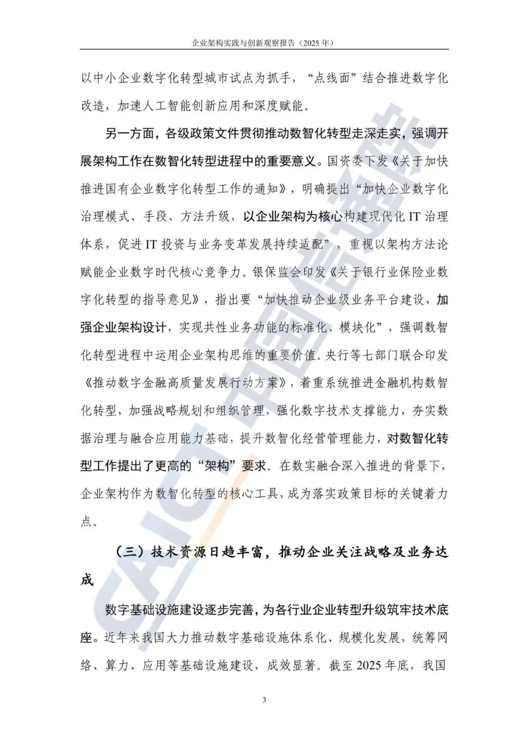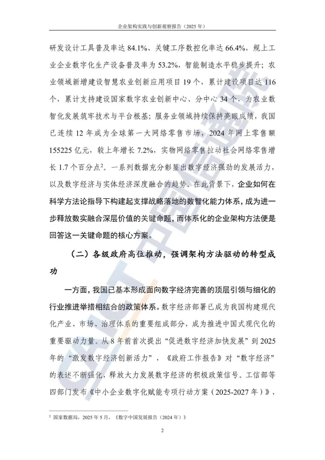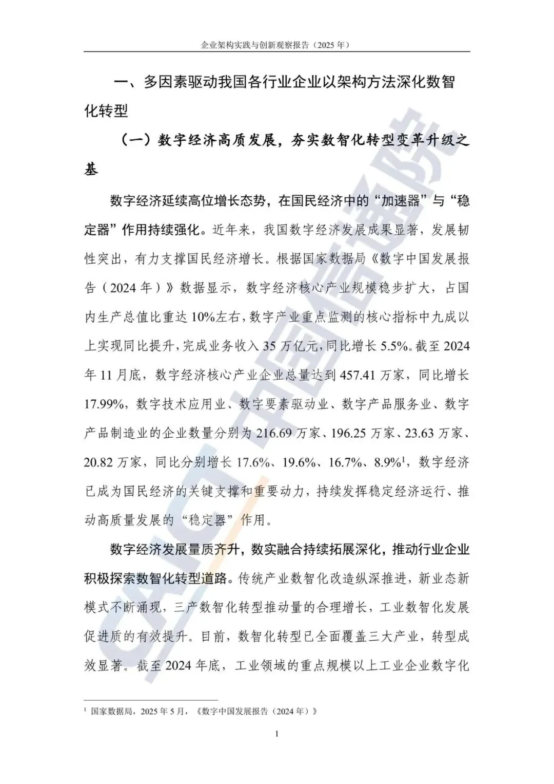 报告从多个维度分析了当前企业深化数智化转型的驱动力。数字经济持续高质量发展,为转型奠定了坚实基础。国家政策高位推动,明确要求以企业架构为核心构建现代化治理体系。数字基础设施日趋完善,技术资源日益丰富,使企业能将更多精力聚焦于战略与业务目标的达成。同时,大型企业进入转型深水区,普遍面临战略与落地分离、业务与技术双轨、数据与决策断层等结构性矛盾,亟需企业架构这类体系化方法来赋能转型落地。