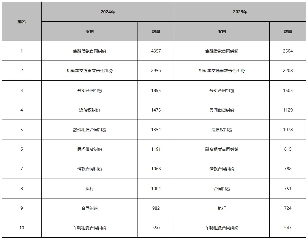 我们分别筛选了审判年限在2024年和2025年的相关案件,其中排名前十的案由如下表所示。