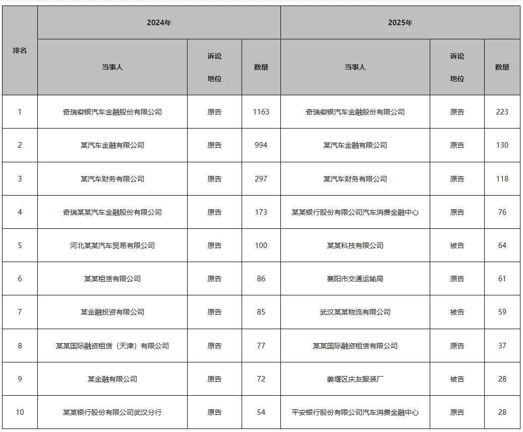 2024年的纠纷高度集中于以汽车金融公司为代表的债权人主动发起诉讼。当年案件数量前十的当事人全部为原告,且几乎均为各类持牌汽车金融机构、融资租赁公司及银行。