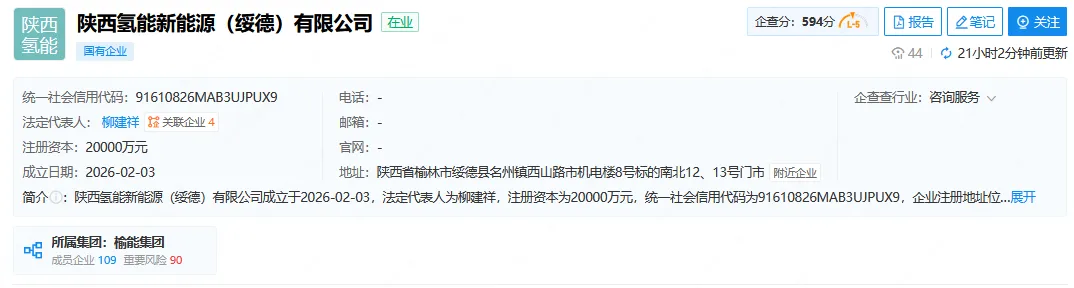 近日,陕西氢能新能源(绥德)有限公司,注册资本20000万元。据企查查提供的股权穿透显示,该公司由陕西氢能新能源有限公司全资持股,为陕西氢能产业发展有限公司的二级子公司。
