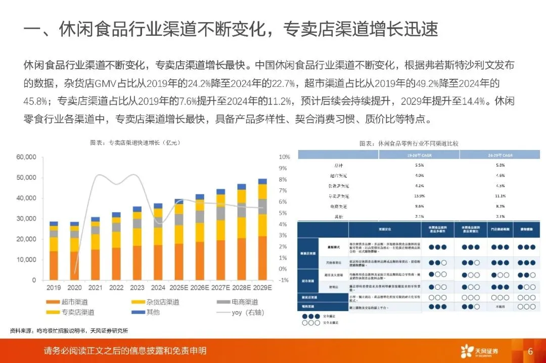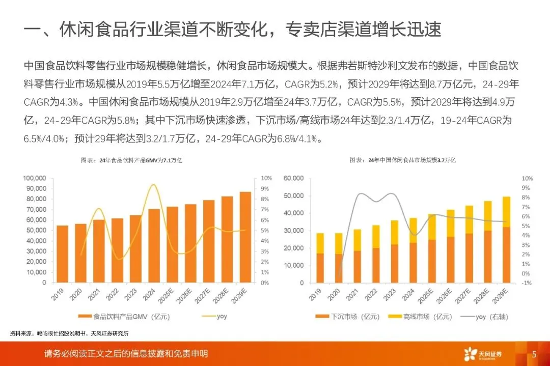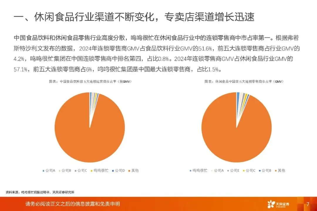 中国休闲食品市场规模从2019年2.9亿增至24年3.7万亿,CAGR为95.5%,预计2029年将达到4.9万亿,24-29年CAGR为5.8%。专卖店渠道占比从2019年的7.6%提升至2024年的11.2%,预计后续会持续提升,2029年提升至14.4%。行业高度分散,鸣鸣很忙在休闲食品行业中的连锁零售商中市占率第一。