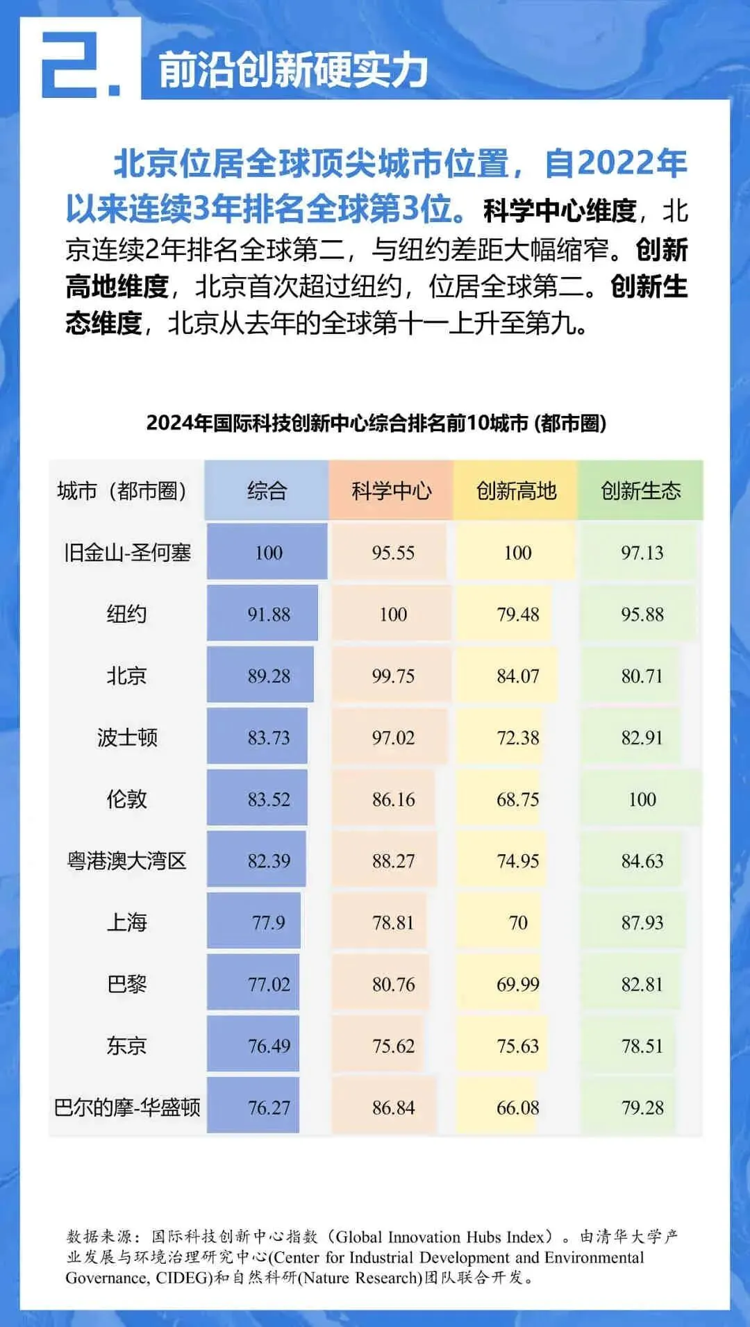 - 细分领域: 科学中心(全球第2)、创新高地(全球第2,首次超越纽约)、创新生态(全球第9)。