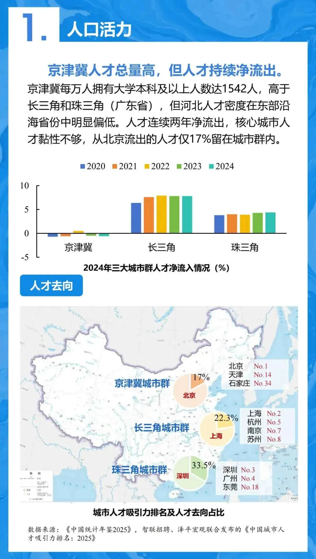 - 人才: 人才连续两年净流出,从北京流出的人才仅17%留在京津冀内部,核心城市人才黏性不足。