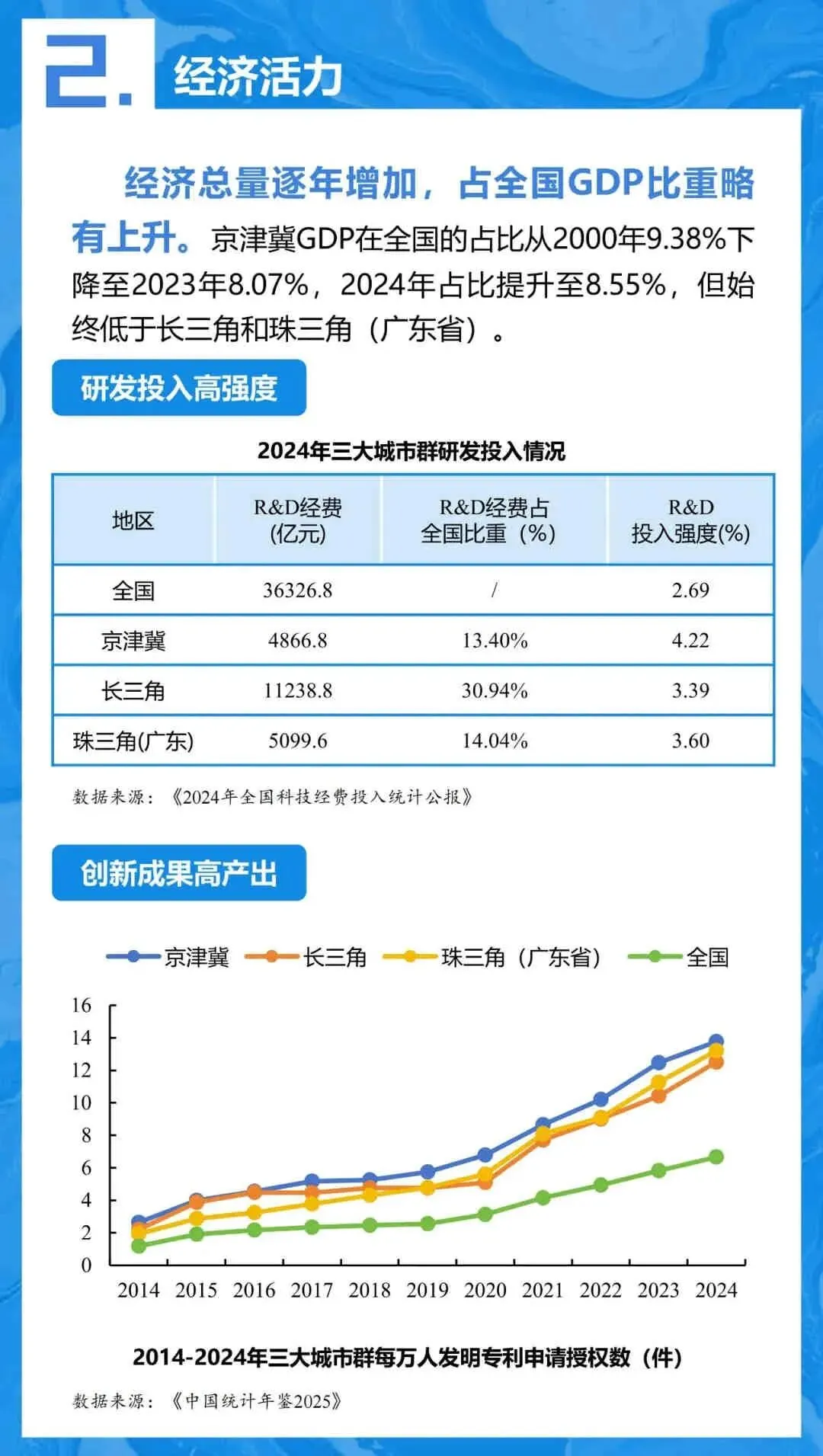 - 总量: GDP占全国比重从2023年的8.07%微升至2024年的8.55%,但仍低于长三角和珠三角。