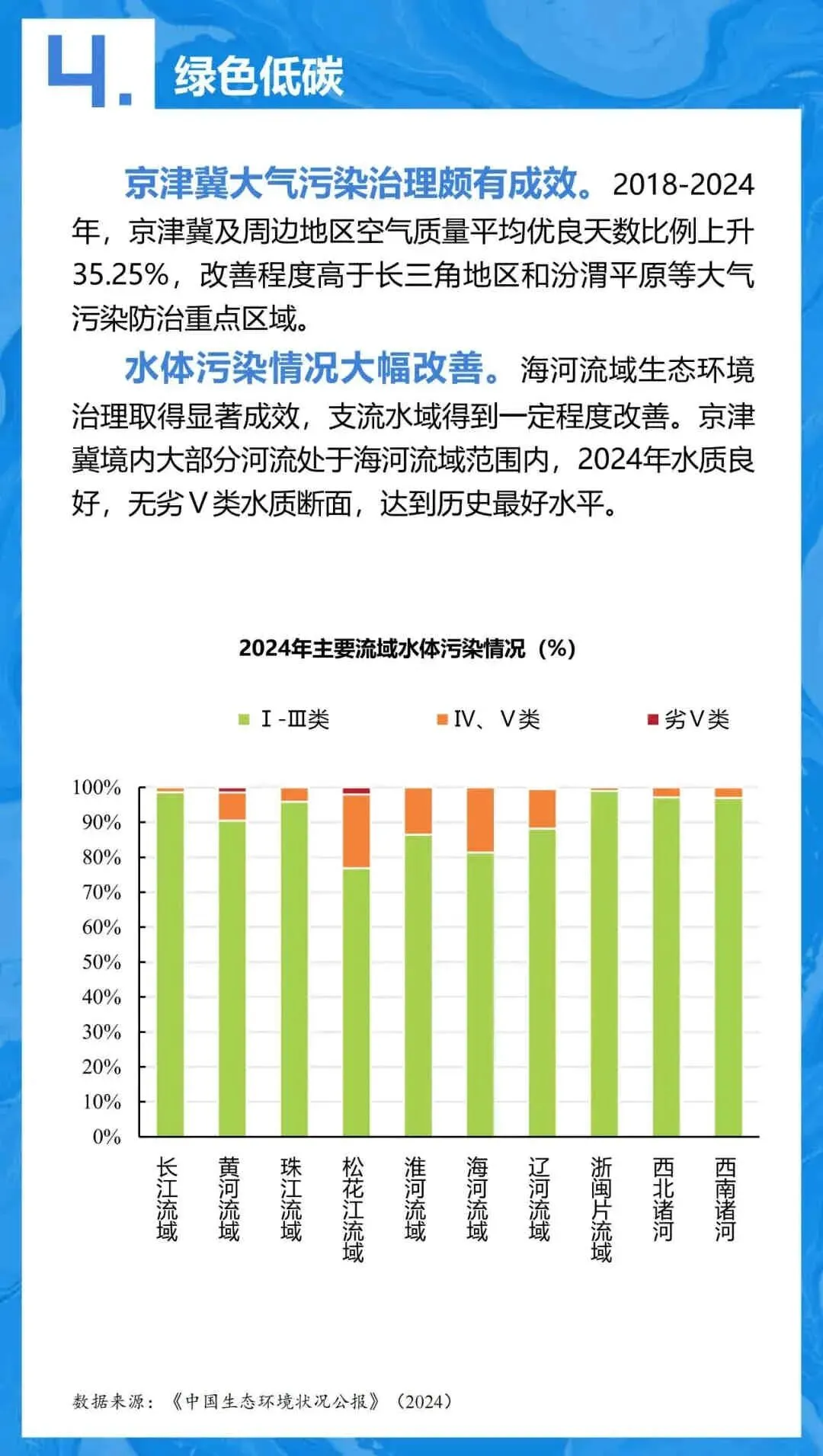 - 水体治理: 海河流域水质达到历史最好水平,无劣V类水质断面。