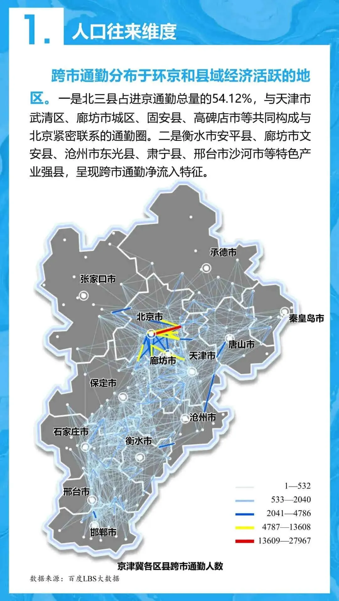 - 人口往来: 北京、天津、廊坊位列前三,跨城通勤主要集中在北三县等地。