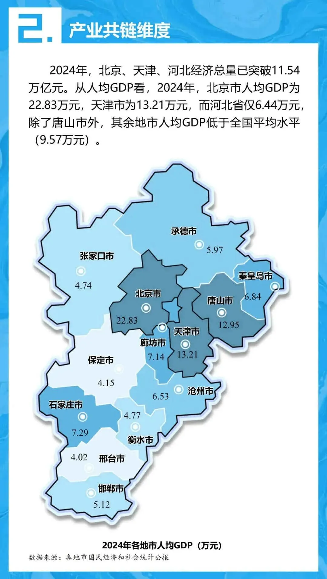 - 产业共链: 北京、天津、石家庄引领,但河北各地市人均GDP普遍低于全国平均水平,区域发展不均衡。
