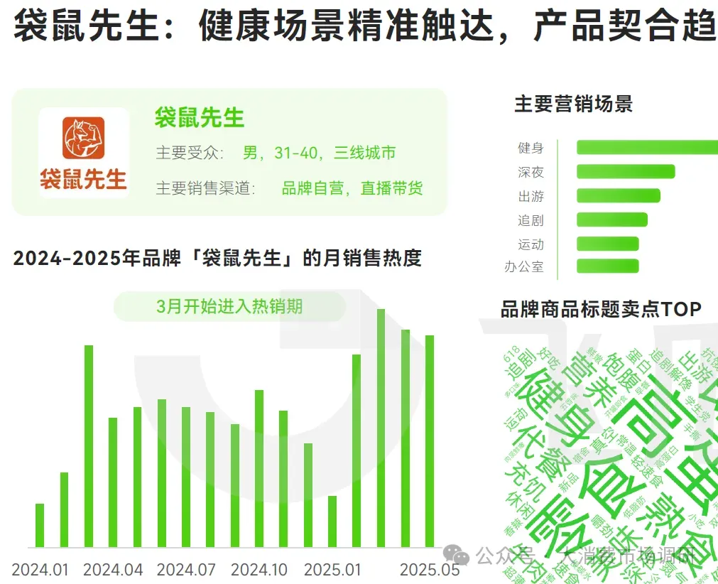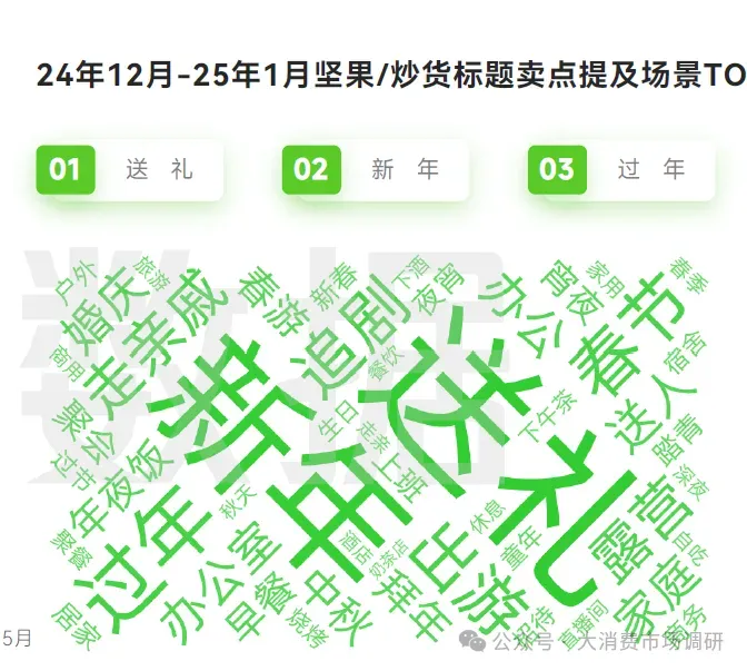 2023-2025 年坚果/炒货品类销售热度呈现明显周期性,每年 12 月-1月因节日集中进入热销期。24年12月-25年1月商品标题卖点提及场景中,"送礼““新年”“过年”为核心,“走亲戚”“拜年”等礼赠场景高频出现。这反映出坚果炒货与节日消费深度绑定,品牌需抓住礼赠旺季,围绕“新年、拜年”等场景打造礼盒产品,强化“节日好礼”心智,借场景营销提升销售热度。